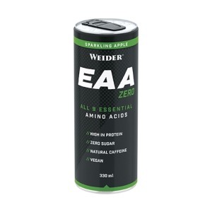 Weider EAA RTD 330ml napitak u limenci je gazirano bezalkoholno piće s kofeinom i svih 9 esencijalnih aminokiselina. Tih devet aminokiselina tijelo ne može proizvesti samo nego ih moramo unijeti putem hrane zbog čega se i nazivaju esencijalnim. Okusi: jabuka ili limun.